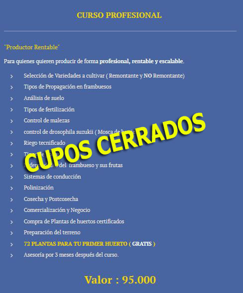 El Curso de Cultivo de Frambuesas se realizará los días Sábados 11, 18 y 25 de abril 2026 Con un horario de 1 hora cada sábado,las clases seran en Modalidad online por la plataforma zoom.